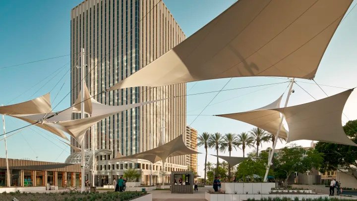 The plaza features 60-foot wind sails that light up with color-changing LED lighting at night, a new stage for events, pavers, landscaping, seating and planter boxes for tenants and visitors.
